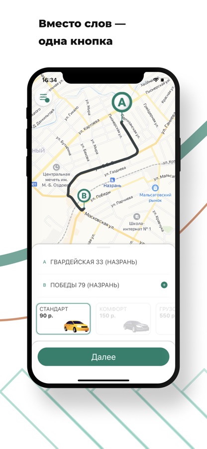 Следите за поездкой на карте. Приложение сообщит время подачи, марку, цвет, номер машины, а также имя водителя.