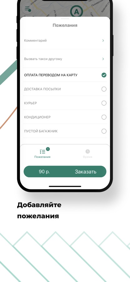 Выбирайте доп. опции: тариф, пожелания к заказу или оплата поездки переводом на карту.