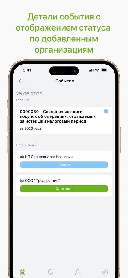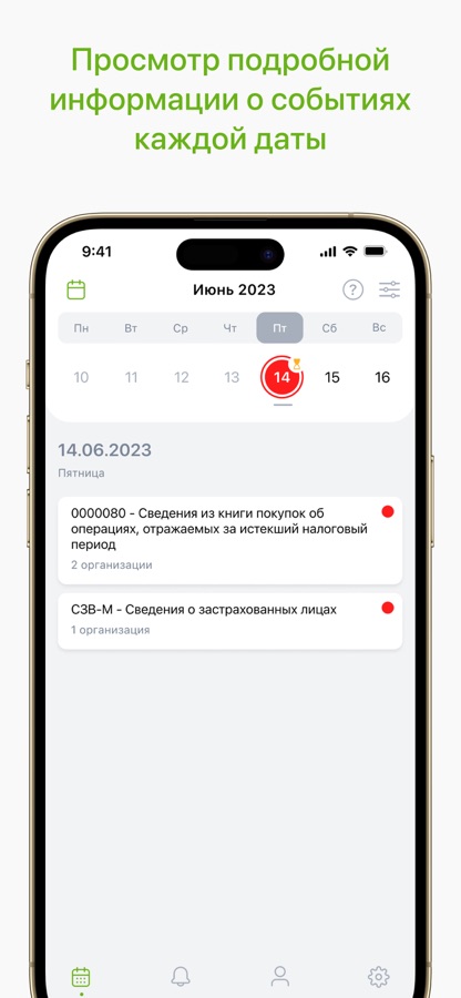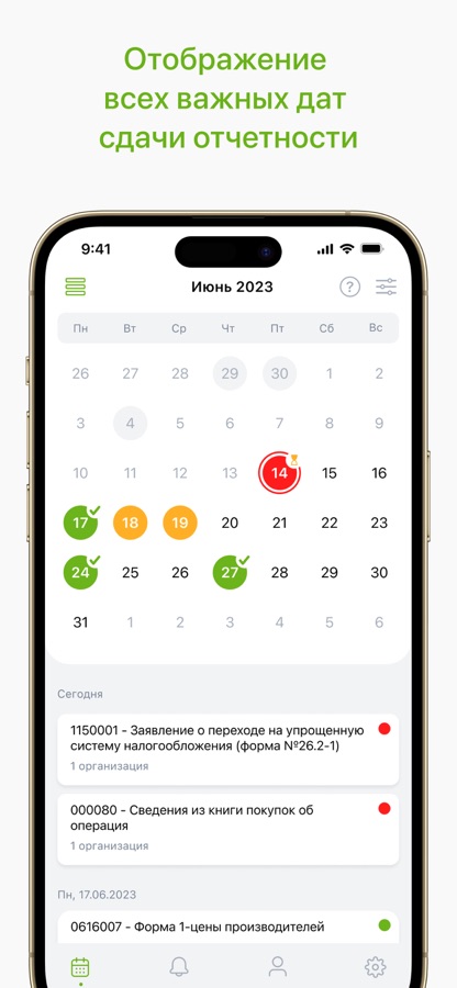 Приложение отмечает все важные даты сдачи отчетности и уведомит о приближающихся сроках.