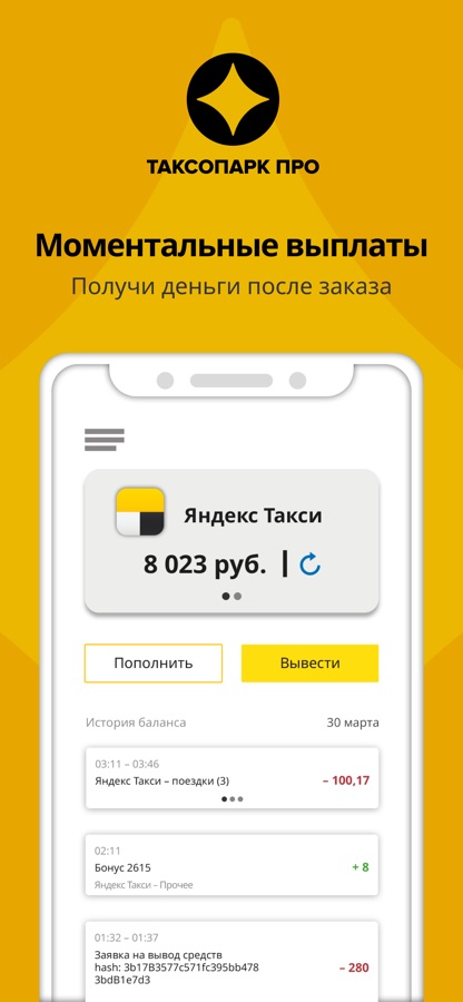 Таксопарк про постоянно создает комфортные условия для водителей такси и курьеров. Наше приложение для водителей Яндекс.Такси, Uber такси и курьеров является простым и понятным для наших клиентов, а вывод осуществляется моментально, без запроса менеджеру Яндекс.ПРО и ожидания расчётного периода в любой день недели. Скачиваете приложение, регистрируетесь в Яндекс.ПРО и выводите денежные средства уже после первого заказа.