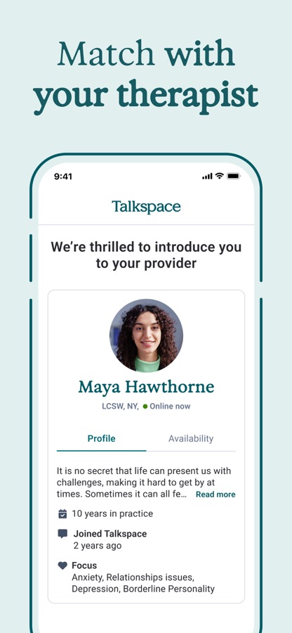 Talkspace is the most convenient and affordable way to improve your mental health. Get matched with a licensed therapist in your state from the comfort of your device, and message via text, audio, and video.