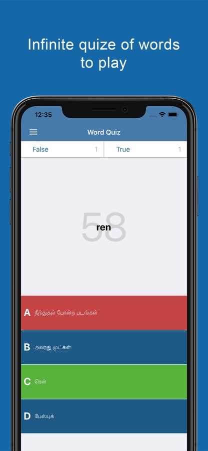 — We developed a new quiz inside Tamil dictionary! To take the quiz, you can easily tap the option icon in the top left side of the screen and choose quiz. Now, you will see a word in the screen with 4 answers, you will have to tap the answer that you think its right to see if it’s the good choice or not.