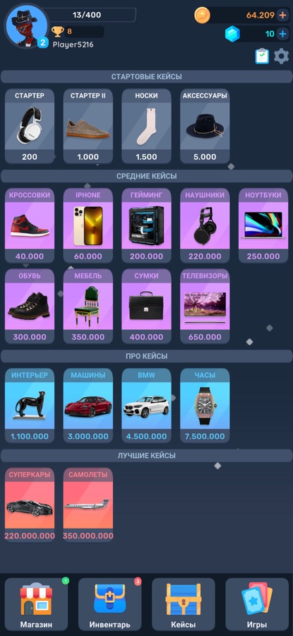 TapCase — Лучший симулятор кейсов с вещами! Много вещей, апгрейды и многое другое! Кейс симулятор позволяет открывать кейсы с вещами, такими как смартфоны, ноутбуки или даже автомобили. Испытай свою удачу в нашем кейс симуляторе и собери самую дорогую и лучшую коллекцию