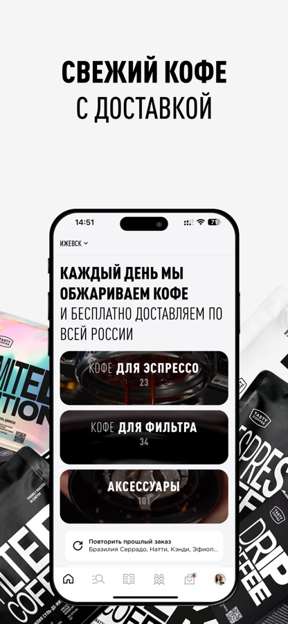 Обжариваем кофе исключительно под заказ и сразу отправляем его, поэтому кофе приходит всегда свежим. Бесплатно доставляем до удобных пунктов выдачи или вашей двери. И кроме того, дарим подарки: при заказе 6 пачек кофе по 250 г можно выбрать в подарок еще одну пачку кофе или чай. А если кофе не понравился, то заменим его или вернем оплату.