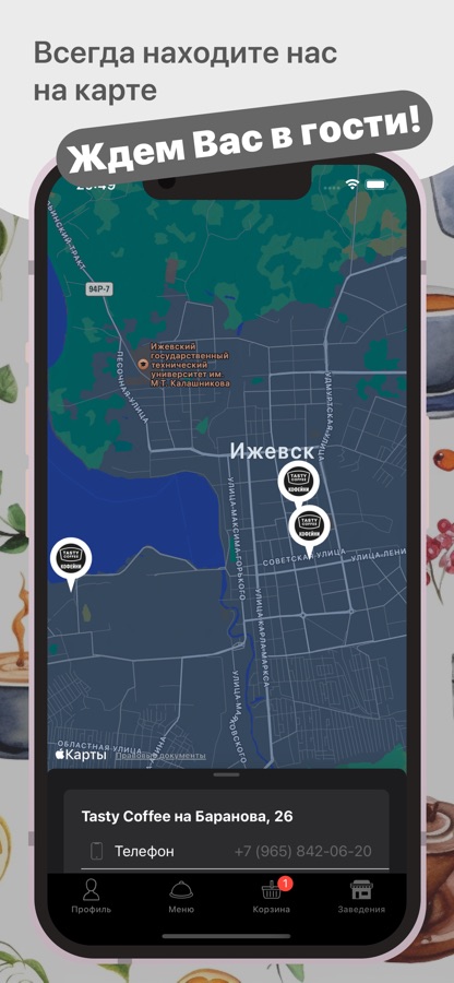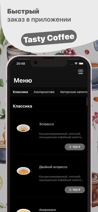 Мобильное приложение “Tasty Coffee” позволит быстро и просто заказать кофе, и вам не придется стоять в длинных очередях.