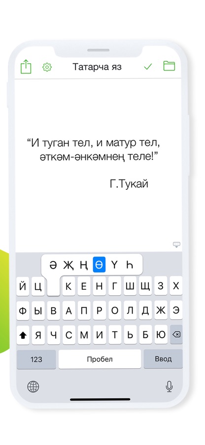 Системная татарская клавиатура для работы в любых приложениях. Включается через системный настройки iOS. Максимально идентична по функционалу с привычной клавиатурой.