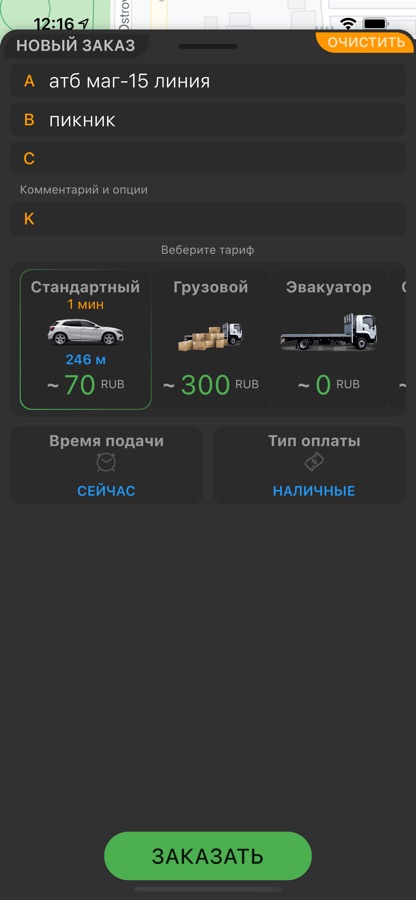 — заказ автомобиля любого тарифа (Эконом, Стандарт, Комфорт);
