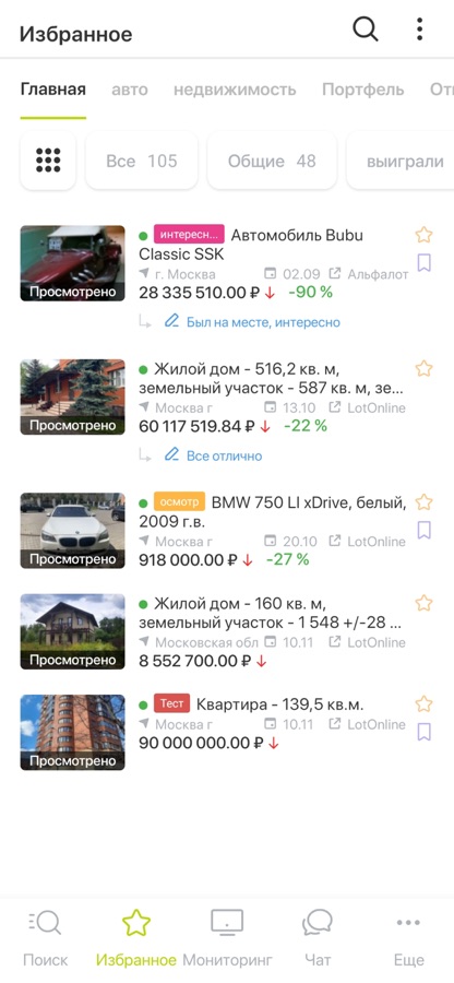 • Фильтрация лотов через систему поиска с сохранением избранных результатов.