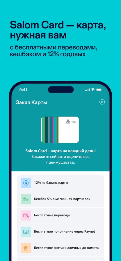 • Salom Card. Карта Humo от TBC Bank с выгодными бонусами: возвратом комиссии за снятие и пополнение карты наличными, кешбэком до 20% на покупки в магазинах- и сервисах-партнёров и 12% годовых на остаток. Выпуск и доставка карты — бесплатно.