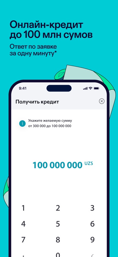 • Онлайн-кредит до 100 млн сумов. Оформление прямо в приложении, без поручителей, залога и лишних документов. Перед тем как взять кредит, можно рассчитать ежемесячные платежи по одобренной ставке в кредитном калькуляторе прямо в приложении.