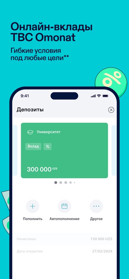 • Онлайн-вклады сроком до 24 месяцев**. Начисляем проценты по вкладу каждый день, а выплачиваем их раз в месяц. Пополнить вклад можно в приложении TBC Bank с любой привязанной карты.