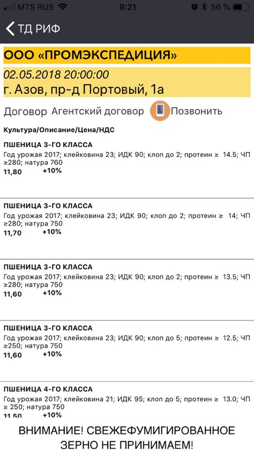Торговый Дом «РИФ» осуществляет закупку и продажу сельскохозяйственной продукции на внутреннем рынке России и экспорта в страны ближнего и дальнего зарубежья. В этом приложении актуальные закупочные цены на пшеницу, ячмень, кукурузу, горох. Вы сможете увидеть всю необходимую информацию по элеваторам и получать изменения цен. Прием товара на элеваторе, обработка документов, отправка груза за рубеж происходит быстро, что давно уже оценили многие фермерские и крестьянские хозяйства — поставщики зерна и сельхозпродукции.