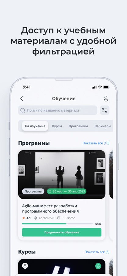 Обучение. Раздел, где хранятся курсы, вебинары, мероприятия и программы. С понятными подсказками: что нужно пройти, когда дедлайн, что уже пройдено.