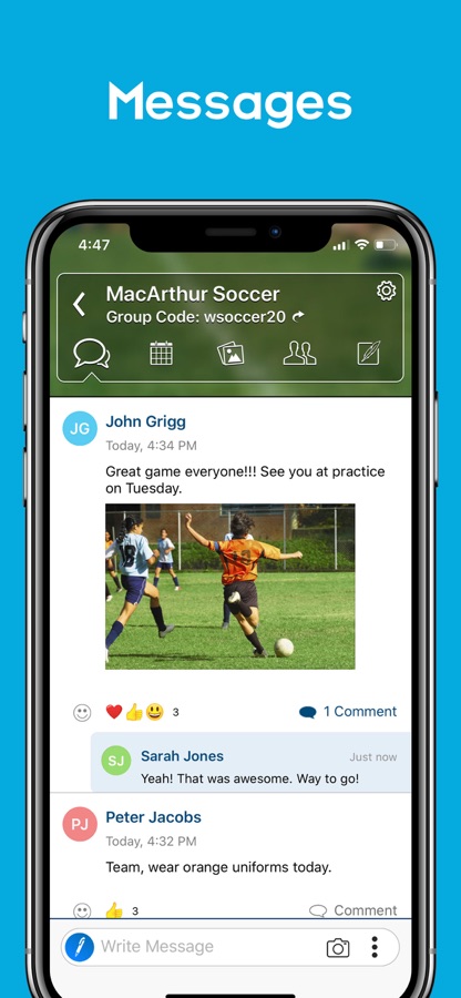 TeamReach is designed to simplify life for everyone involved. Managers and coaches can create teams in seconds, and parents or players can easily join by entering a group code. The team has a central place for all communication, and this eliminates the need for phone calls, emails, and handouts.