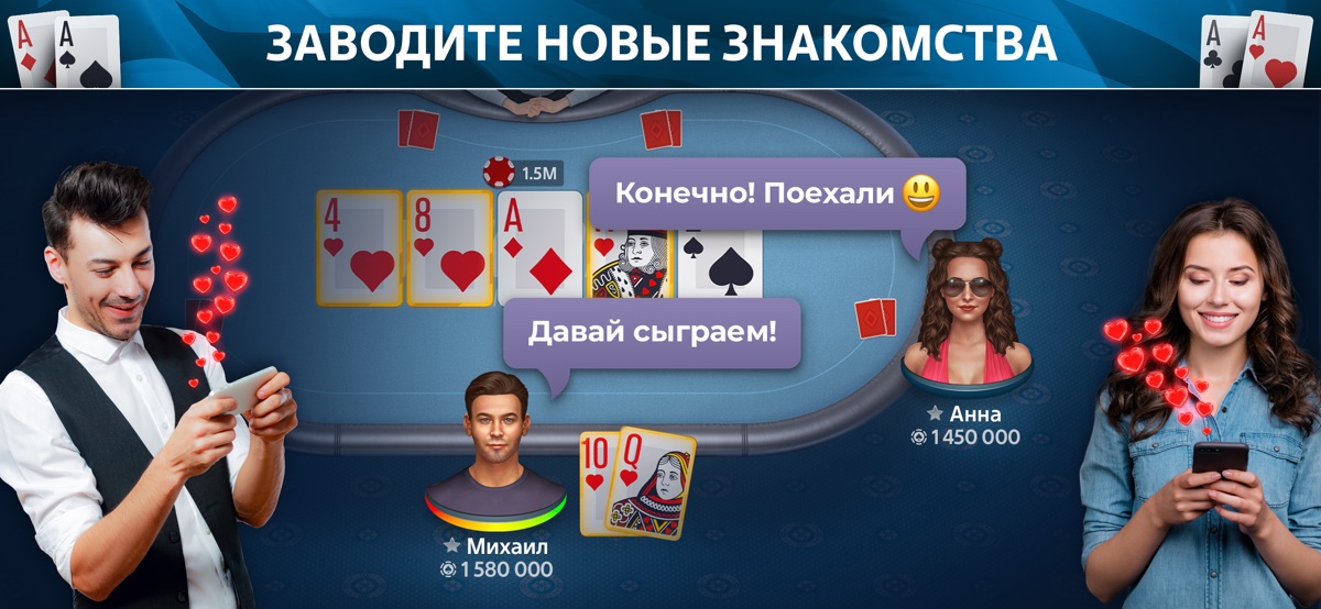 ЗАВОДИТЕ НОВЫЕ ЗНАКОМСТВА: Общайтесь с любителями покера со всего мира. Заводите друзей в нашем чате, делитесь стратегией игры в покер или просто говорите обо всем на свете.