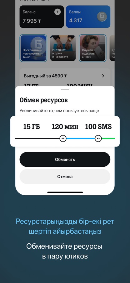• Ресурстарды өзара алмастырып, басқа Tele2 клиенттерімен бөлісу
