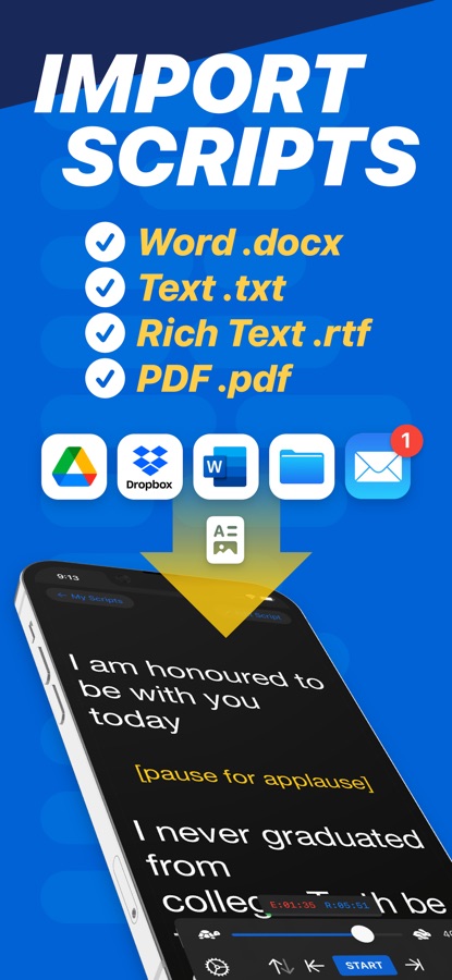 • Import PDF, Word, Powerpoint, txt and rtf files instantly from any of your favourite apps