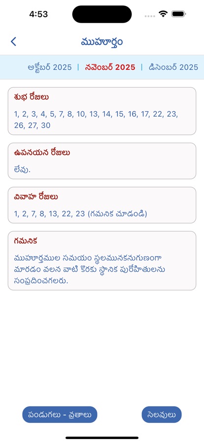 * Muhurtas – Find auspicious dates for marriage, upanayan, and more