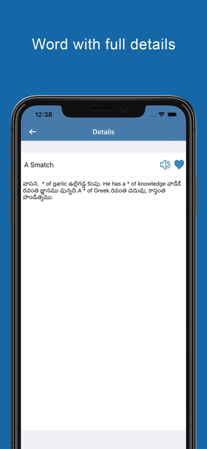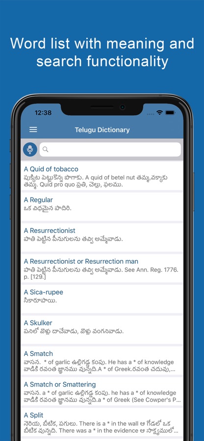 Our new English to Telugu Dictionary and Translator app is a light weight and elegant tool. You can find over 80,000+ english words with their Telugu meanings for Free on your smartphone! You can easily search for any word you want and we will take care of giving the meaning of it and the best thing is that you can take quiz to test your knowledge in this Indo-Aryan language.