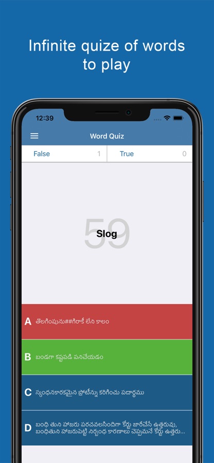 — We developed a new quiz inside Telugu dictionary! To take the quiz, you can easily tap the option icon in the top left side of the screen and choose quiz. Now, you will see a word in the screen with 4 answers, you will have to tap the answer that you think its right to see if it’s the good choice or not.