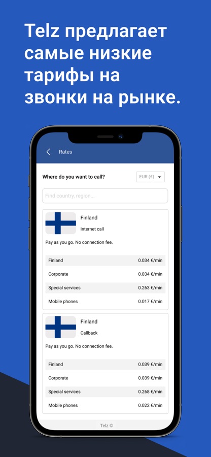 Telz предлагает самые низкие тарифы на звонки на рынке. Тарифы не зависят от страны, в которой вы находитесь. Вы можете проверить наши цены сразу после загрузки приложения, даже не пройдя активацию. Команда Telz ежедневно следит за качеством и всегда готова помочь.