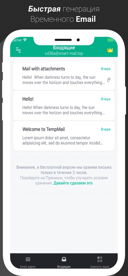Это приложение является улучшенной версией сервисов, которые также известны как 10minutemail, disposable-mail, fake email, guerrillamail, mailinator, getairmail, mohmal mail, throwawaymail, tempmail, tempail, anonymous-mail, spambox, tmail, burnermail, trashmail, 20minute email и другие. Отличительная особенность нашего приложения — повышенная надежность и возможность разблокирования уникальный премиальных функций.