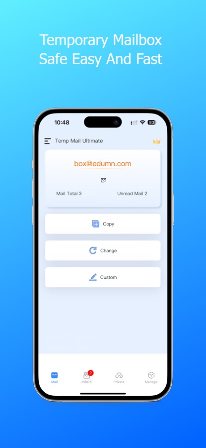 Temp Mail Ultimate is a disposable email service. With the app, only one click is needed to generate a new disposable email address,unlimited mailboxes can be created and managed easily. Once the used mailbox is deleted, spam will no longer be a disturbance.