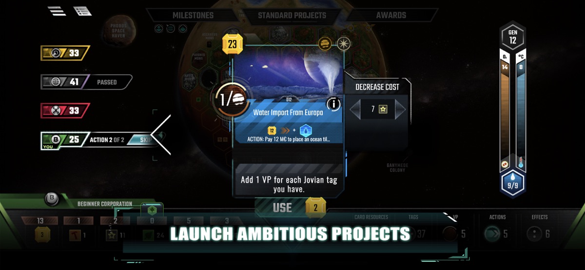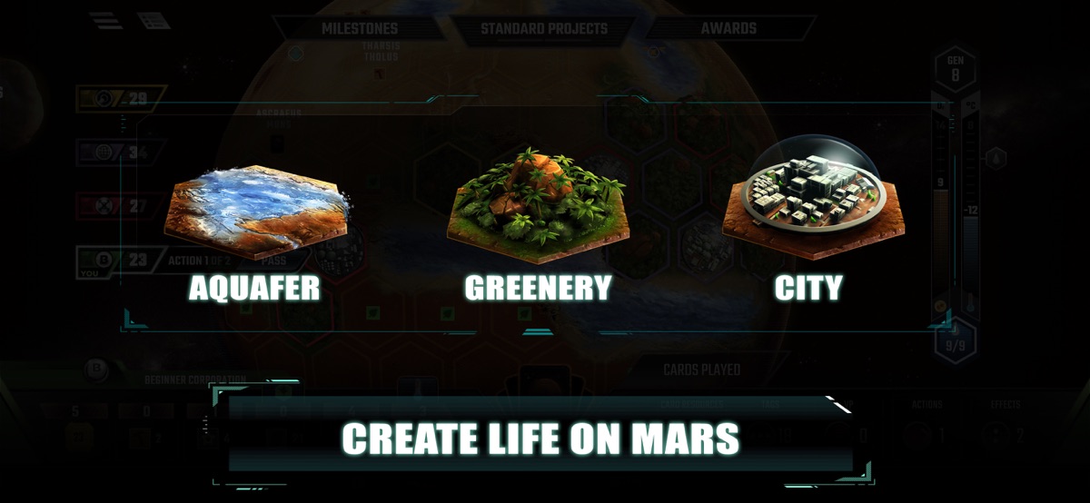— Achieve a high Terraform Rating, by increasing the temperature and oxygen level or creating oceans… Make the planet habitable for future generations!