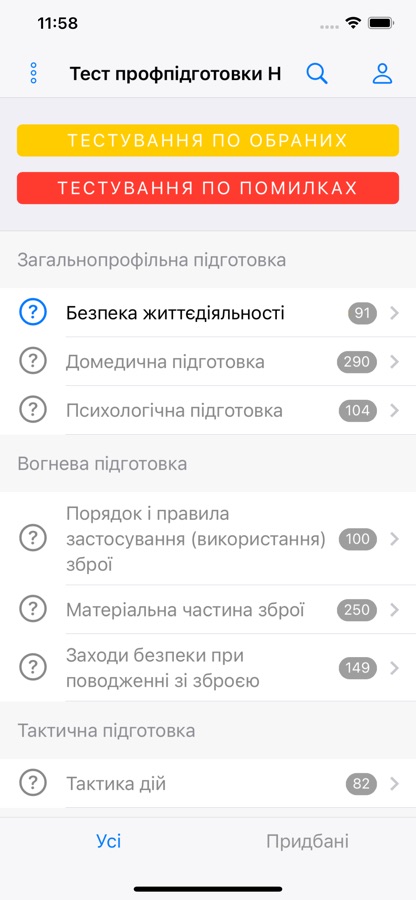 ▪ Можливість додавання питань в «обрані» та проходження по них окремого тестування;