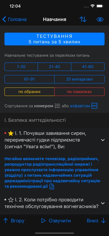 **Навчальний режим включає можливість проходження всіх питань потрібного розділу по порядку чи випадково, або всіх питань потрібної теми відповідного розділу.