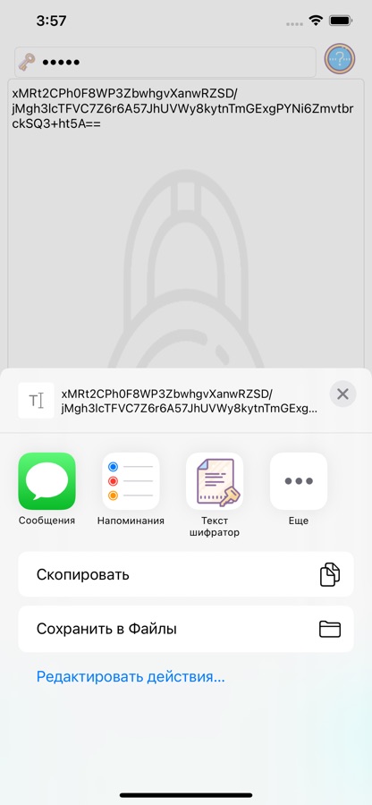 Чтобы перенести зашифрованный текст в другое приложение, коснитесь значка копирования, который копирует зашифрованный текст, и его можно вставить в любое другое приложение.