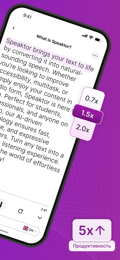 С SPEAKTOR вы можете наслаждаться историями и статьями, слушая их. Он читает вслух любой текст, содержимое, документ или книгу, предоставленную ему, что делает возможным чтение для всех, кто не умеет или не умеет читать хорошо. Благодаря технологии синтезатора речи вам больше никогда не надоест ваша аудиокнига.