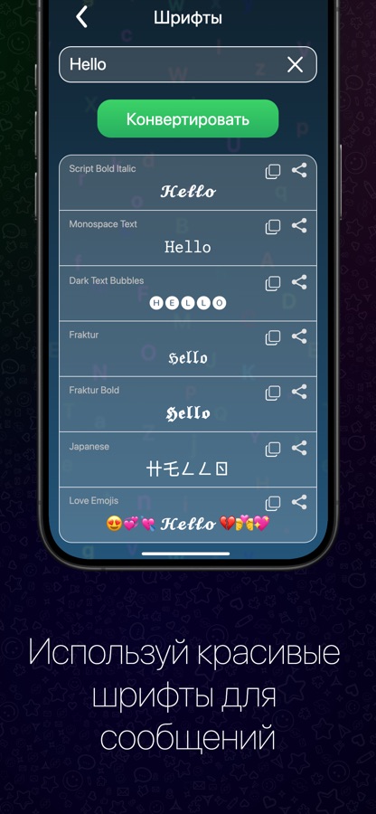 Не хотите терять времени? Отправляйте 10 000 слов прямо из приложения в ваши любимые мессенджеры и удивляйте друзей необычными текстовыми шедеврами.