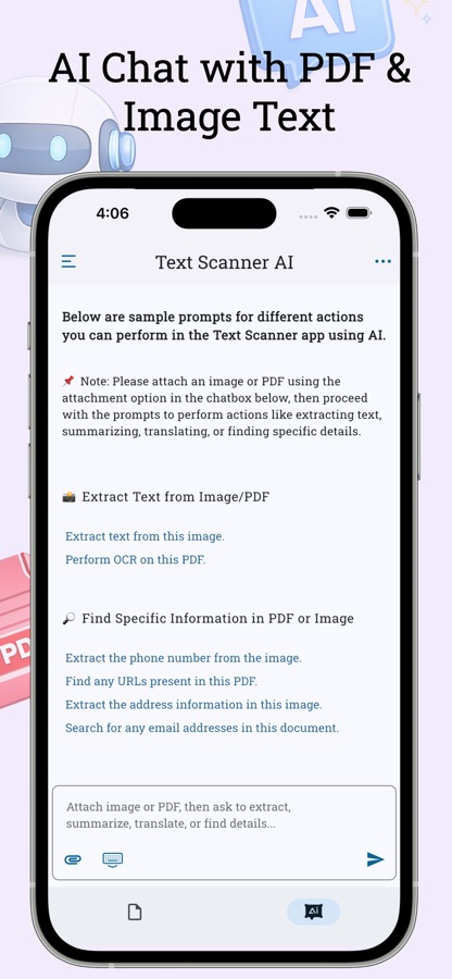 AI OCR — Attach an image or PDF and chat with AI to ask questions, summarize content, or translate text instantly.