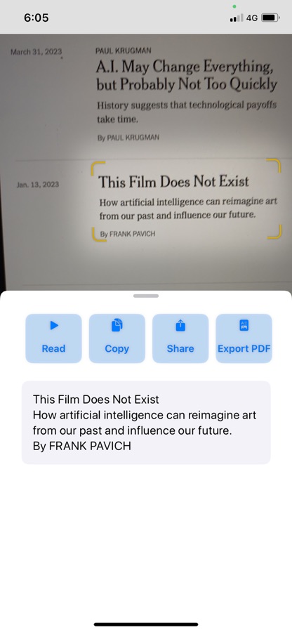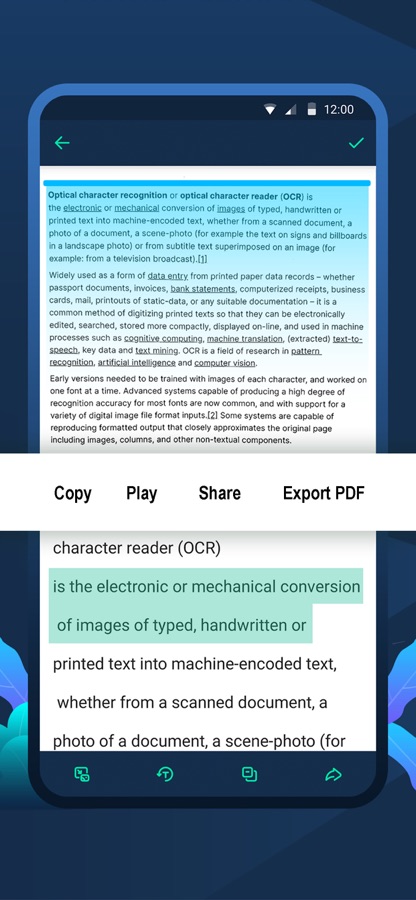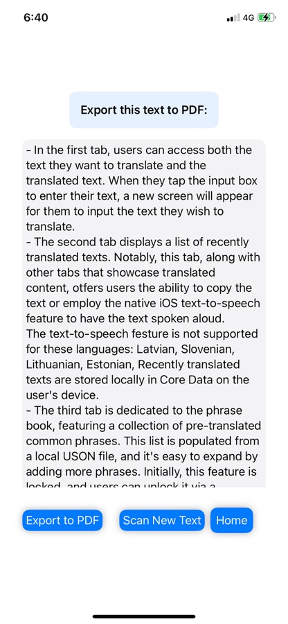 Экспорт в PDF: Преобразуйте извлеченный текст в профессиональный формат PDF одним касанием, идеально подходящий для архивирования и обмена.