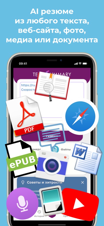 Вы можете вводить текст прямо в приложении, вставлять его из других источников, импортировать файлы, открывать ссылки или просто сфотографировать страницу или печатный текст с помощью камеры. Text Summary распознаёт содержимое и автоматически превращает его в структурированные обзоры.