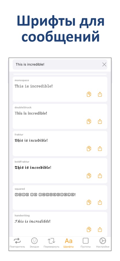 Приложения для создания необычных и веселых сообщений! Создать удивительное сообщение очень легко! Вы можете менять шрифт в своих сообщениях, повторять текст множество раз, а так же перевернуть текст или слово. В приложении есть другие возможности, устанавливайте и попробуйте прямо сейчас!