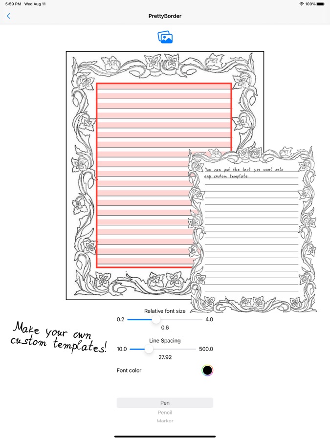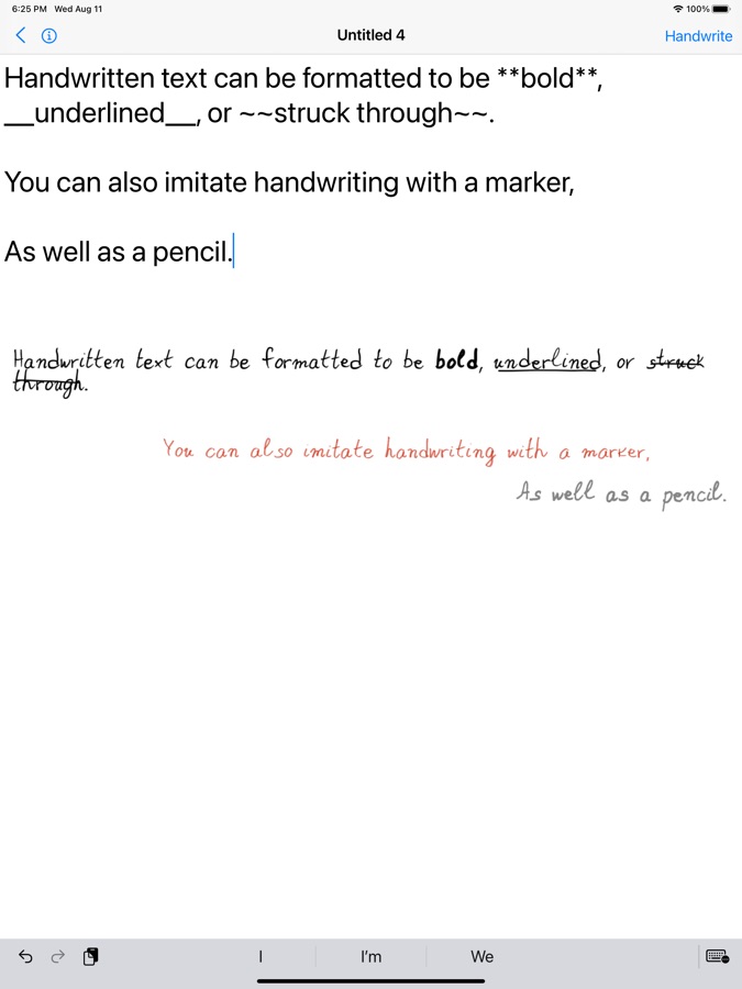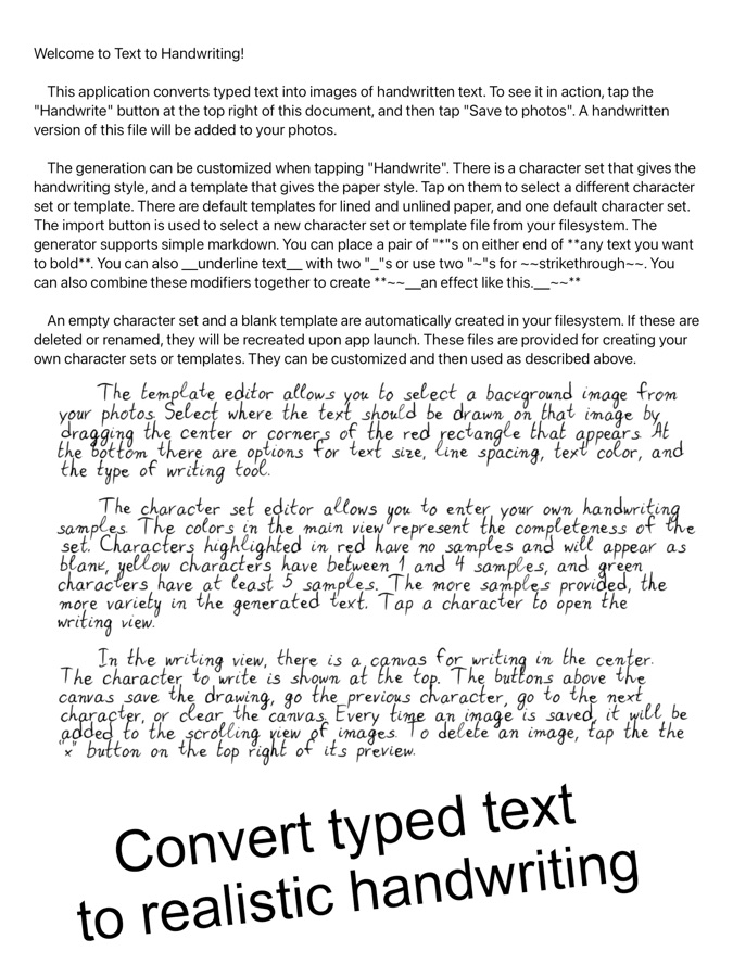 Turn any typed text into a picture of handwritten text with the push of a button. Select from a number of preset paper backgrounds or create your own from the Photo Library. Use the default handwriting style or make your own by writing each character yourself. Write multiple instances of characters for more convincing handwriting.