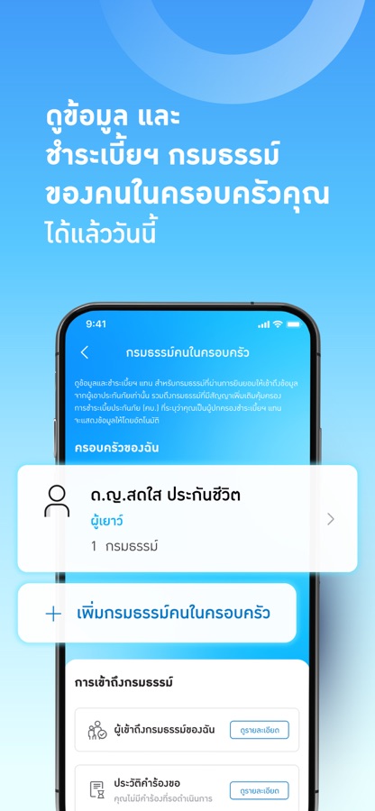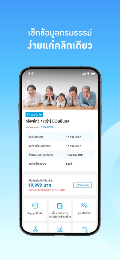 บริการด้านธุรกรรมประกันชีวิต เพื่อให้คุณสามารถเข้าถึงข้อมูลกรมธรรม์ พร้อมรายละเอียดความคุ้มครองได้ทุกที่ทุกเวลา และอีกหลากหลายการใช้งานที่พร้อมตอบทุกความต้องการของลูกค้าคนสำคัญเช่นคุณ อาทิ