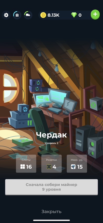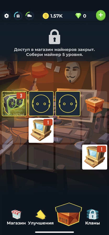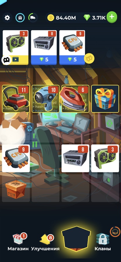 Куча майнеров. В игре более 50 разных устройств для, которыми ты можешь фармить биткоин.Поэтому ты можешь майнить хоть на утюге, хоть на бабушкином калькуляторе. Кликай на коробку, чтобы тебе привезли новый хлам из которого ты соберешь новый майнер.