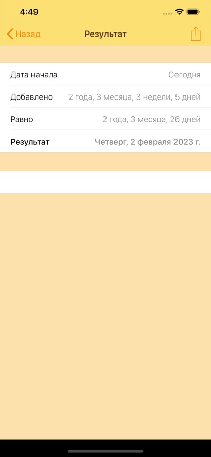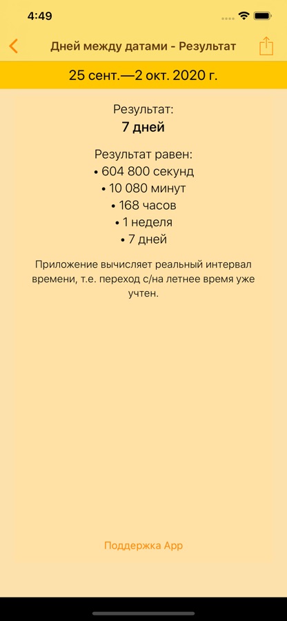 Приложение автоматически преобразует результат в различные единицы времени: годы, дни, минуты, секунды, часы.