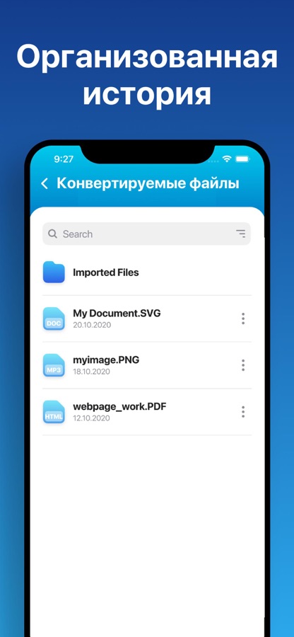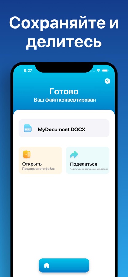 Сохранйте ваши конвертированные файлы, делитесь ими или открывайте их в считанные секунды в ваших любимых приложениях. Просматривайте ранее сохраненные файлы в браузере файлов нашего приложения.