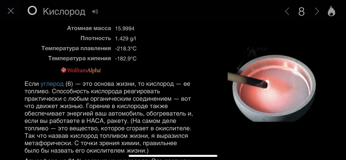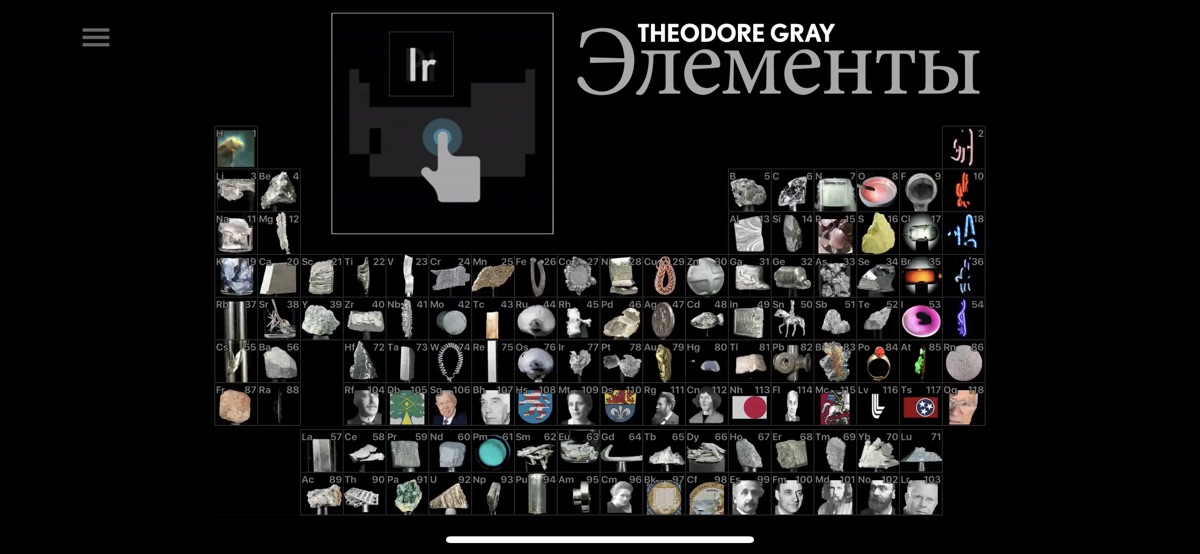 Вы начинаете у полноценной таблицы Менделеева, в которой каждый элемент показан с плавно вращающимся примером. Чтобы открыть статью об олове, коснитесь оловянного солдатика. Для статьи о золоте коснитесь золотого самородка. Вы сразу же увидите как данный пример заполняет почти весь экран, снятый в высочайшей чёткости и вращающийся перед вашими глазами. Рядом вы увидите колонку фактов и данных, каждого из которых можно коснуться для вызова детальных подробностей и текущей информации через встроенную поддержку системы извлечения знаний Wolfram|Alpha.