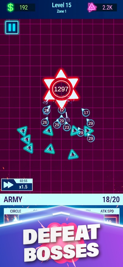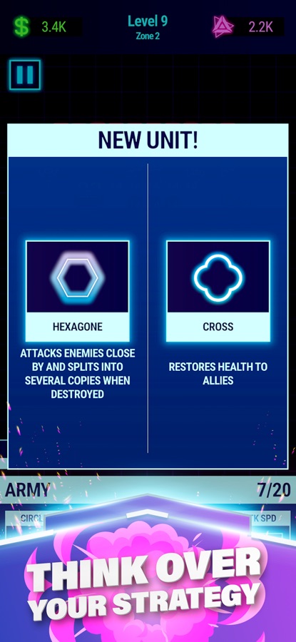 Уникальные герои и айдл-механика: Отважные квадраты, ведущие огонь на дальние дистанции, при падении распадаются на четверых меньших воинов, продолжающих сражение. Шестиугольники, подобно лезвиям бури, вихрем проносятся сквозь ряды противников, разрывая их на части. В момент гибели они расщепляются на два новых шестиугольника, которые, в свою очередь, при уничтожении делятся еще на пару, словно неуязвимая гидра, внося в игру элементы айдл-стратегии.