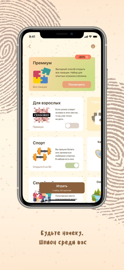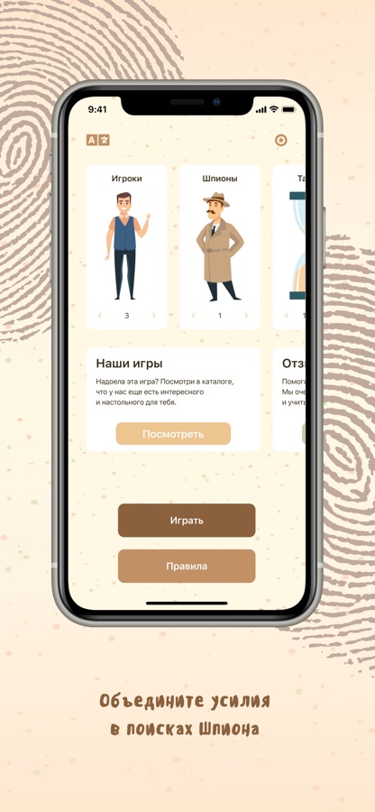 Шпион — это весёлая настольная игра в разговорном жанре. Вам потребуется только смартфон с установленной игрой и компания от трёх человек. Чем больше вас будет, тем сложнее и интереснее будет играть.