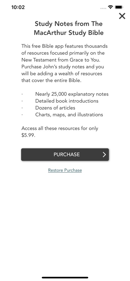 With the in-app purchase of the notes from The MacArthur Study Bible, you’ll have access to nearly 25,000 detailed comments by John MacArthur that explain virtually every passage in the Bible. Along with the notes are dozens of articles, charts, maps, introductions to each book of the Bible, and more.