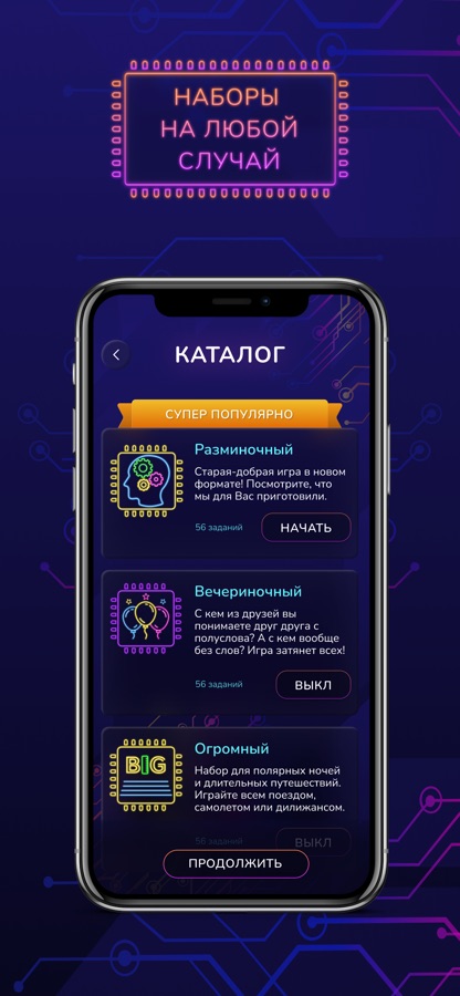 Мы собрали урожай сочнейших слов с лексических полей, словарных сусеков и языковых закромов, чтобы подходящий набор был у вас под рукой. Если вам надо передружить незнакомую компанию или развеселить посеревших коллег — берите набор «Вечериночный», получится отличная игра для знакомства! Если вы неутомимые контактеры и вам нужна игра в дорогу, скажем, в пеший переход через Альпы, берите с собой «Огромный» набор — точно хватит. Набор «Семейный» создан специально для детского праздника или уютного вечера у очага. «Приключение» пропитано кострами далеких земель и древними легендами. От «Жуткого» набора волосы стынут в жилах. В «Приколдесном» мы собрали сленг нескольких поколений и всякие баламбешки — вышел полный хохотач. А если вы не на шутку распалились, не боитесь двусмысленности и готовы к проникновенным контактам — открывайте «Запретный». Мастодонты игры и опытные контактеры пусть попробуют справиться с «Экзотическим» и «Редким» наборами! А для настоящих ветеранов словарного дела есть невероятно сложный «Невероятный» набор.