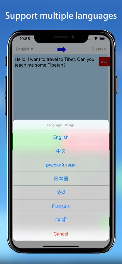 Support English, Russian, Chinese, Japanese,Hindi, French, Nepali to Tibetan.