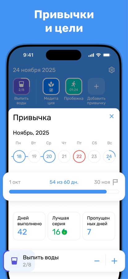 — обзор деятельности за день, неделю и месяц на экране «Статистика»;