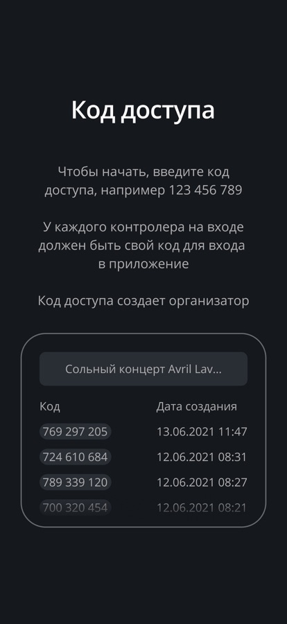 Чтобы начать работы с приложением организатору необходимо создать код доступа в личном кабинете на сайте Ticketscloud, а затем передать его контролеру на мероприятии. Контролер запускает приложение, вводит полученный код и приступает к сканированию билетов.